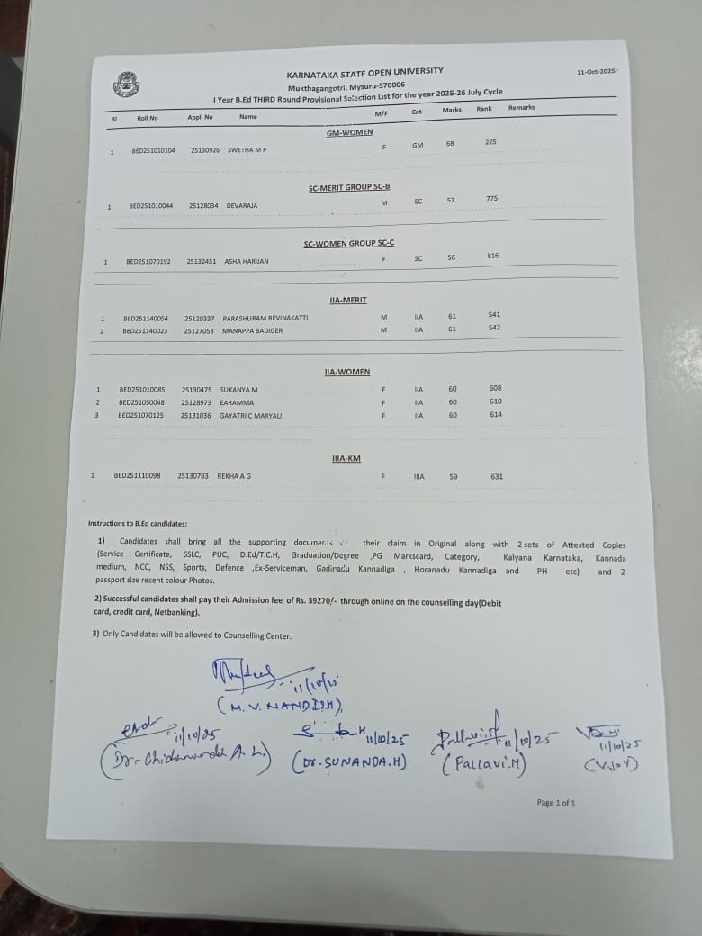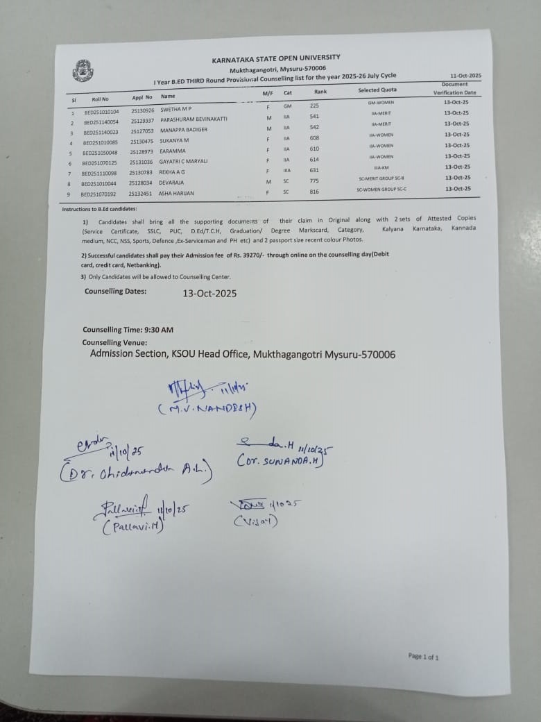 Third Round B.Ed Provisional Counselling list for the academic year 2025-26(Dt:11-10-2025)